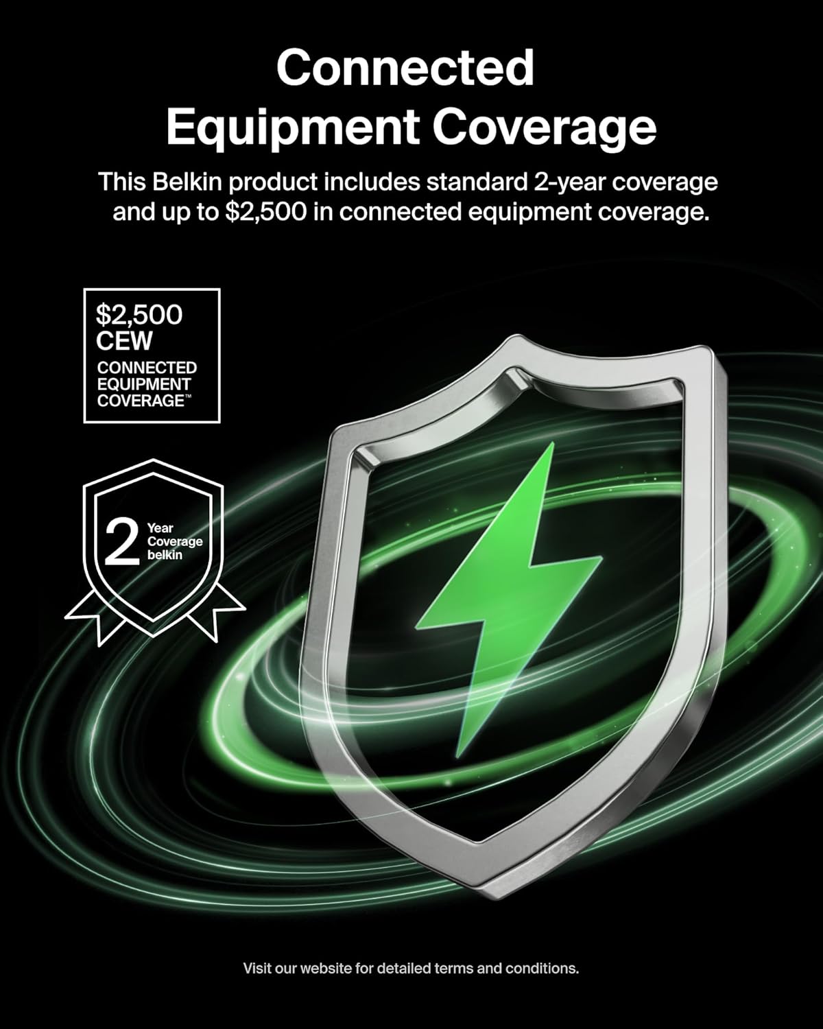 **$2,500 Connected Equipment Warranty: if your device is damaged by an electrical charge while properly connected to this product, Belkin will repair or replace it up to a value of $2,500U.S./2,500€/2,000£