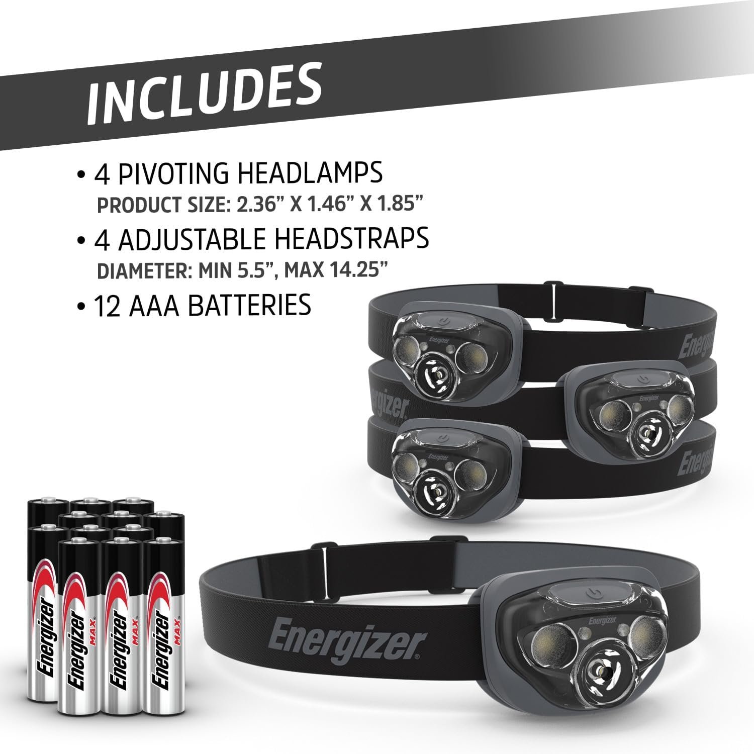 [Headlamp LED Light]: Four (4) Energizer Vision HD + LED Headlamp offers a hands-free, bright LED light with a long runtime for extended use