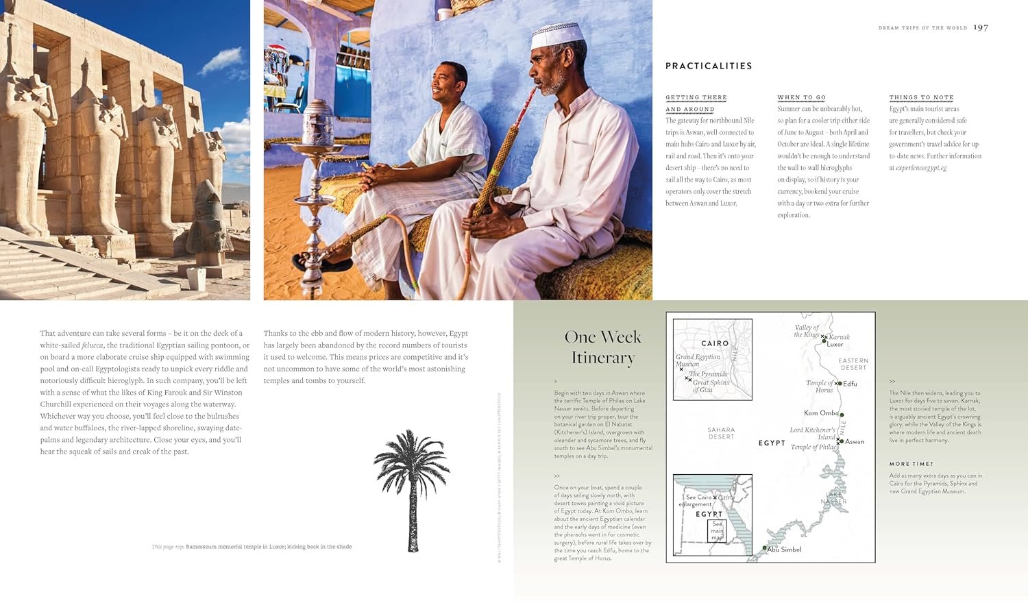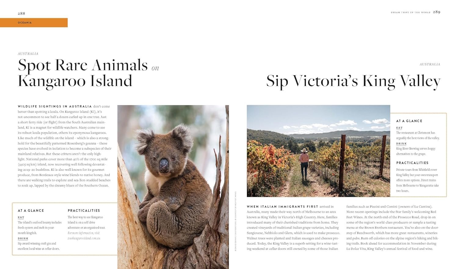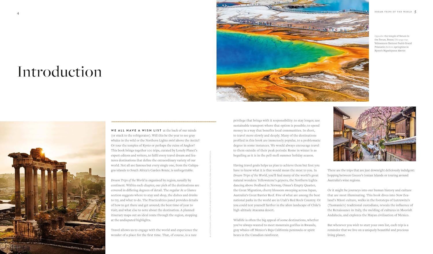 100 dream trips to destinations all over the globeDetailed itineraries for adventures from two days to three weeks with suggestions on areas to visit, must-see sights and landmarks, and unforgettable activities At a glance recommendations on where to eat, sleep and shop, plus the must-do experiences to enjoy during your tripTravel experts and local voices present insights and local knowledge to help you fulfil your travel goalsEssential practical planning information including how to get there with details of sustainable transport options where possible, when to go, and things of note including gear to pack for different climatesBreathtaking photography to inspire your next adventure and 50 detailed mapsDream trips include: Americas & Antarctica – Expedition to Antarctica; trekking in Patagonia; island hopping in the Bahamas; rafting the Grand Canyon; discovering Kaua ‘i’s natural wonders. Europe – Road tripping Iceland’s epic ring road; romance in Paris; Andalucia’s magical cities; hiking the Juliana Trail. Africa & the Middle East – cruising the Nile; road tripping through Namibia; mountain gorillas in Rwanda; the empty quarter of Oman. Asia & Oceania – Bhutan’s blissful valleys and monasteries; following a Southeast Asian food trail; diving into the Southern Great Barrier Reef; discovering New Zealand’s South Island’s legendary landscapes
