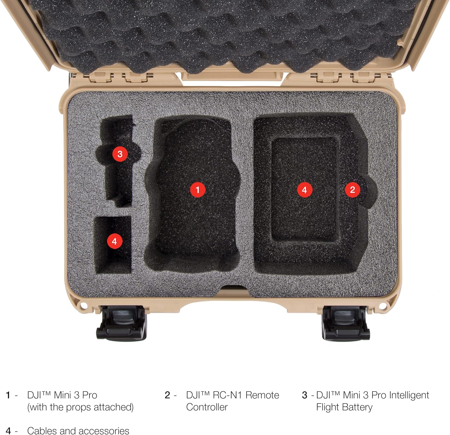 Nanuk 909 hard case fitted with a custom foam insert to safely and efficiently store the DJI Mini 3, RC-N1 Remote and other accessories