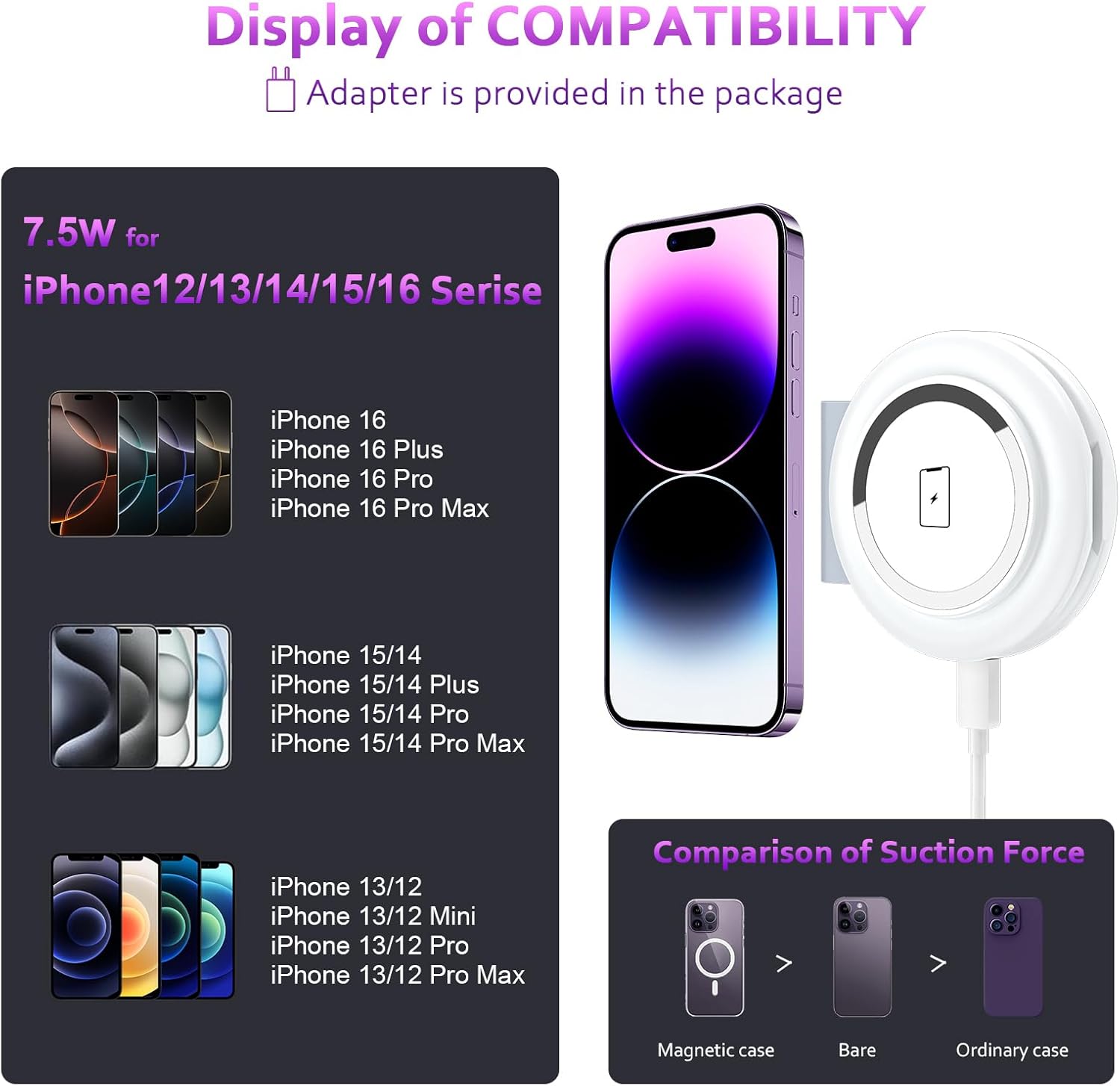 Multi-Apple Application: Compatible for Apple devices that support magnetic suction function, such as iPhone 12/13/14 /15 /16series, AirPod 2/3/4/Pro, iWatch full series. Note: 1, Not compatible for Samsung brand products. 2, please use the full set of accessories in the package 3, Please connect the external power supply when using. 4, Do not use too thick protective case charging.