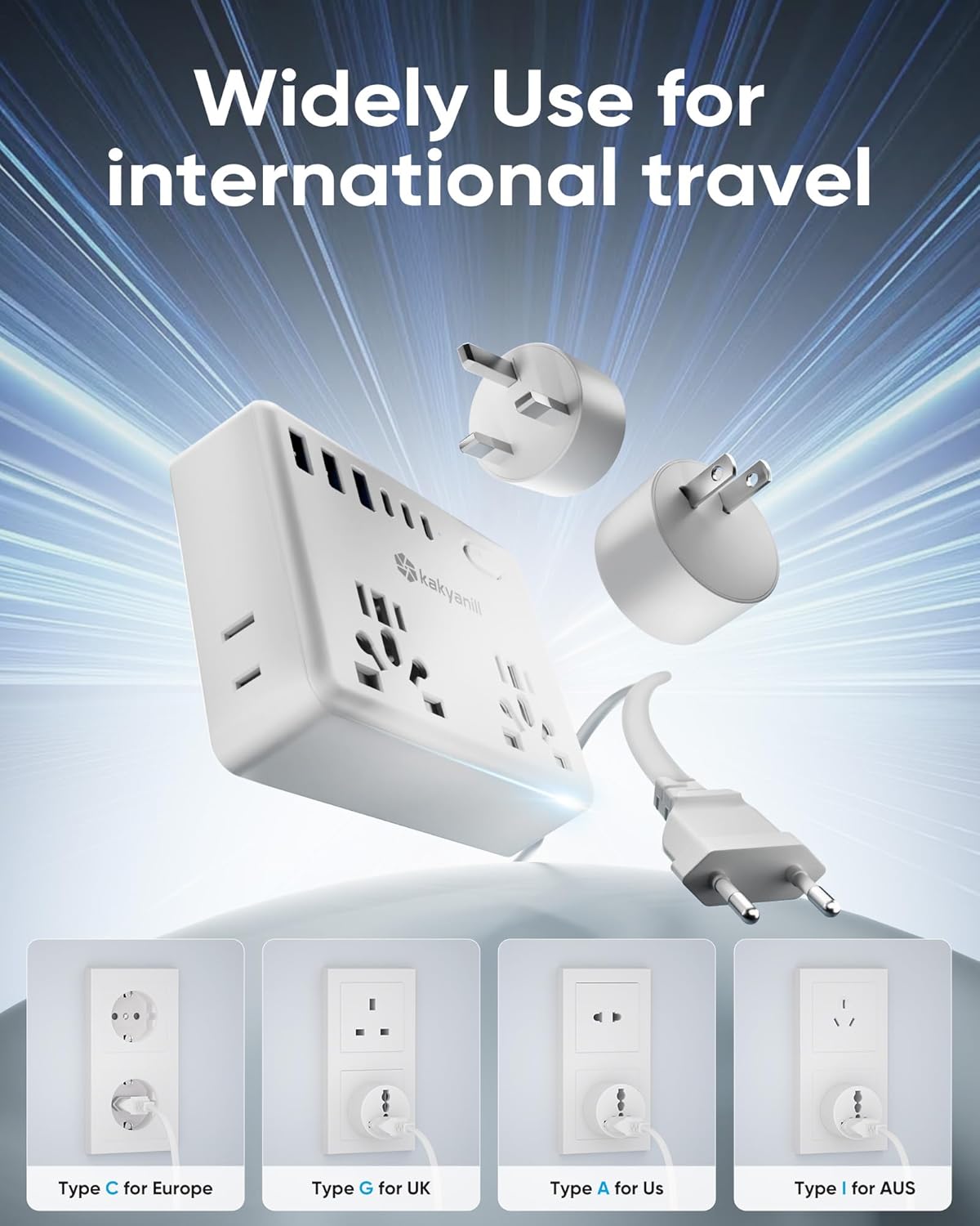 Includes 4 types of international adapters – EU(Type C), UK (Type G), Australia (Type I), JP (Type A) plugs compatible with most of the world