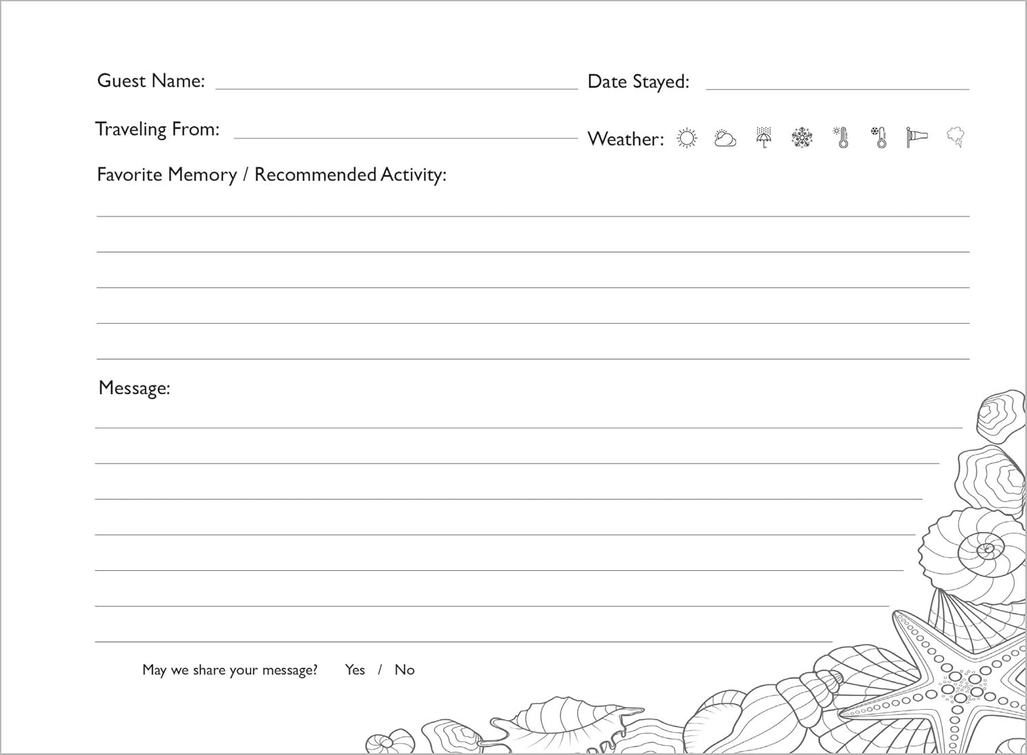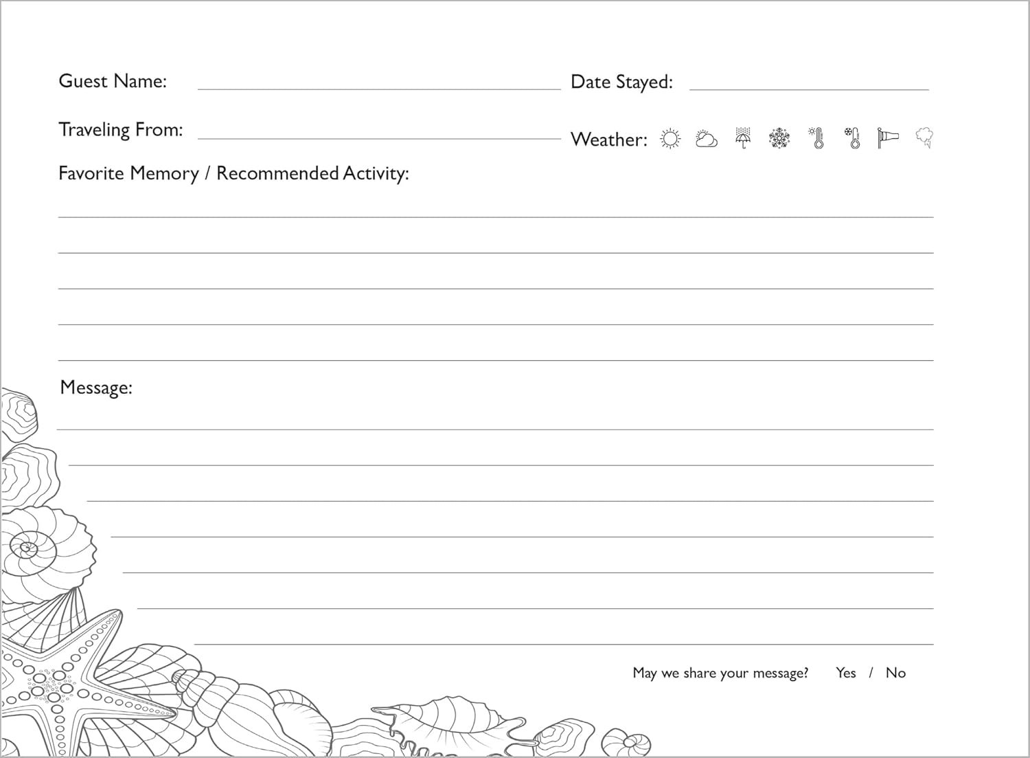 If you host guests overnight then this guest book is perfect for your visitors to record their favorite memories and testimonials. Includes Welcome Page with space for host to write a personalized message. This visitor guest book is perfect for vacation rentals or as a bed and breakfast guestbook, airbnb comment book, or holiday stay log book. Unique beach house coastal ocean theme design. Includes Welcome Page with space for host to write a personalized message. 8.25 x 6 inches (210mm x 152mm), 150 pages front and back. Hardcover binding with a sleek matte finish.